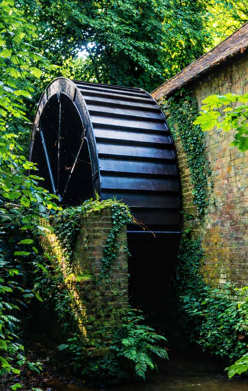 The Water Mill was built around 1860 and it is one of the few remaining working Poncelet Breast-Shot wheels in the UK. It was used to drive a rack saw bench in the sawmill where trees from the estate were brought for cutting. The water wheel is 4.5 metres in diameter. There are 56 metal buckets. When the wheel was originally rebuilt it involved replacing over 1000 bolts. The wooden teeth on the cogs are made from Hornbeam trees, which can be seen growing by the side of the mill. There are 4 cogs of different sizes with different numbers of teeth. The second cog has 102 teeth, and the smallest cog has 12 teeth. A total of 260 teeth!