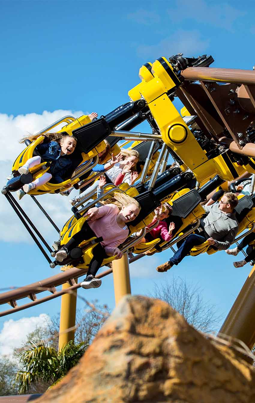 Take to the skies with Flight of the Pterosaur! Riders fly into a prehistoric suspended coaster adventure over Lost Kingdom. With feet dangling, guests soar and swoop through amazing Jurassic scenery. The 1m height requirement makes it a favourite teen ride stepping up from children’s rides to proper thrill rides.